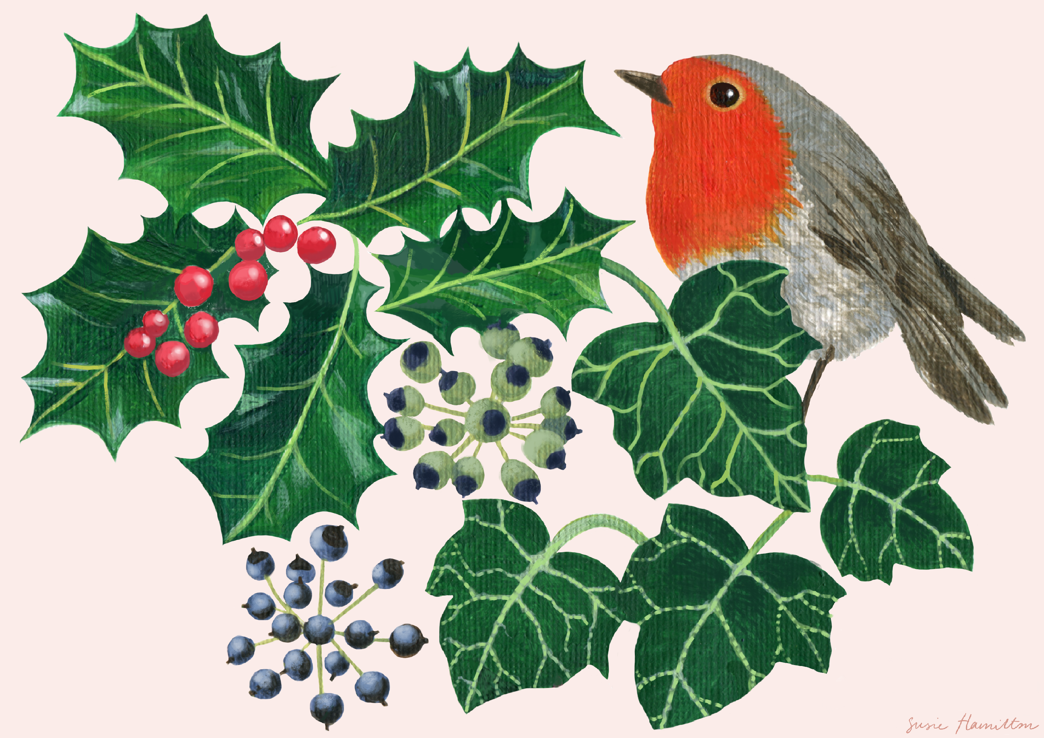 Our new robin friend flew from bush to bush down the lane as we walked - such a friendly little walking companion. Here he is nestled in the Holly bush entwined with Ivy leaves.
