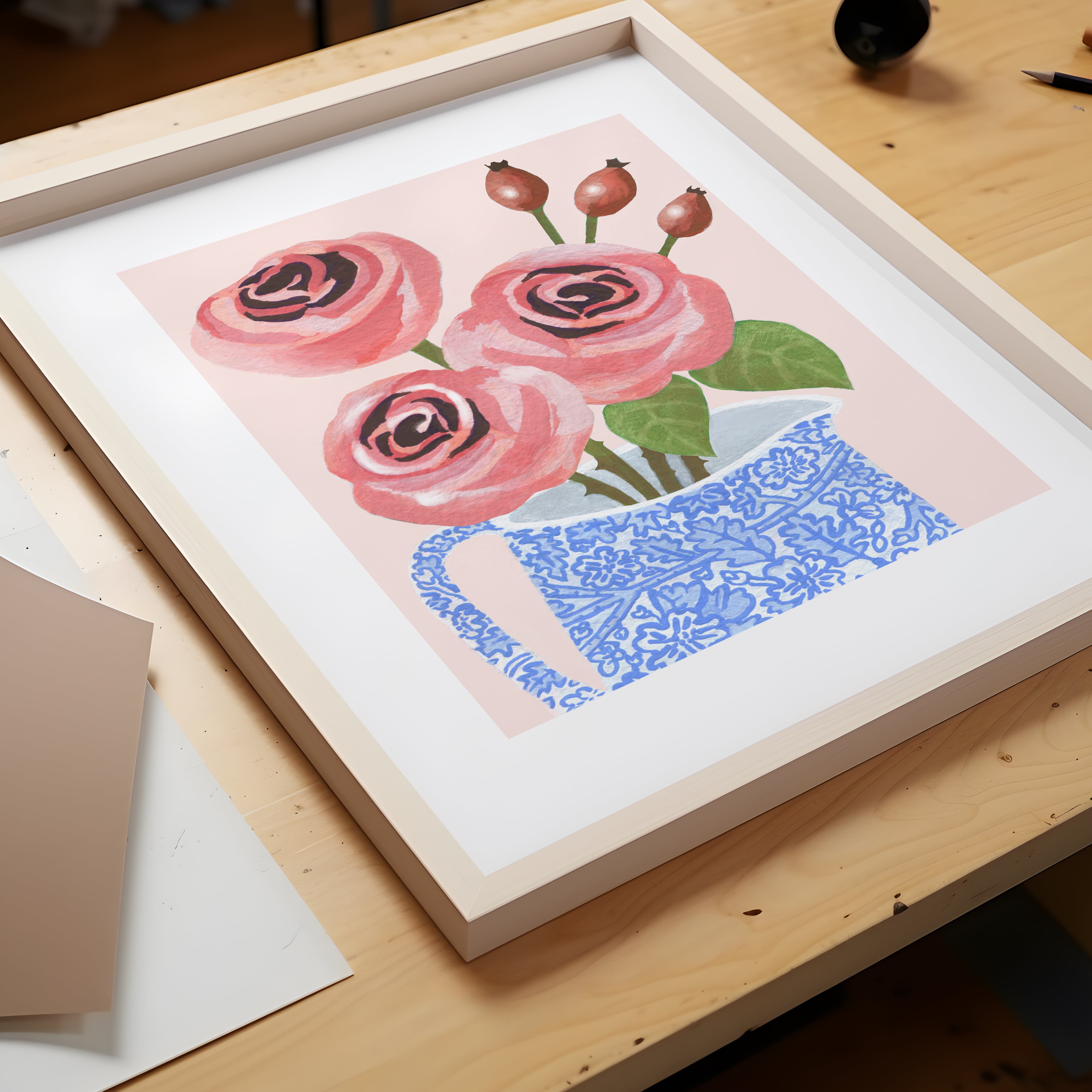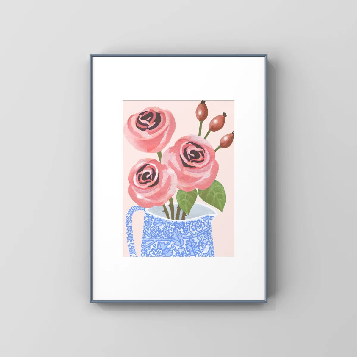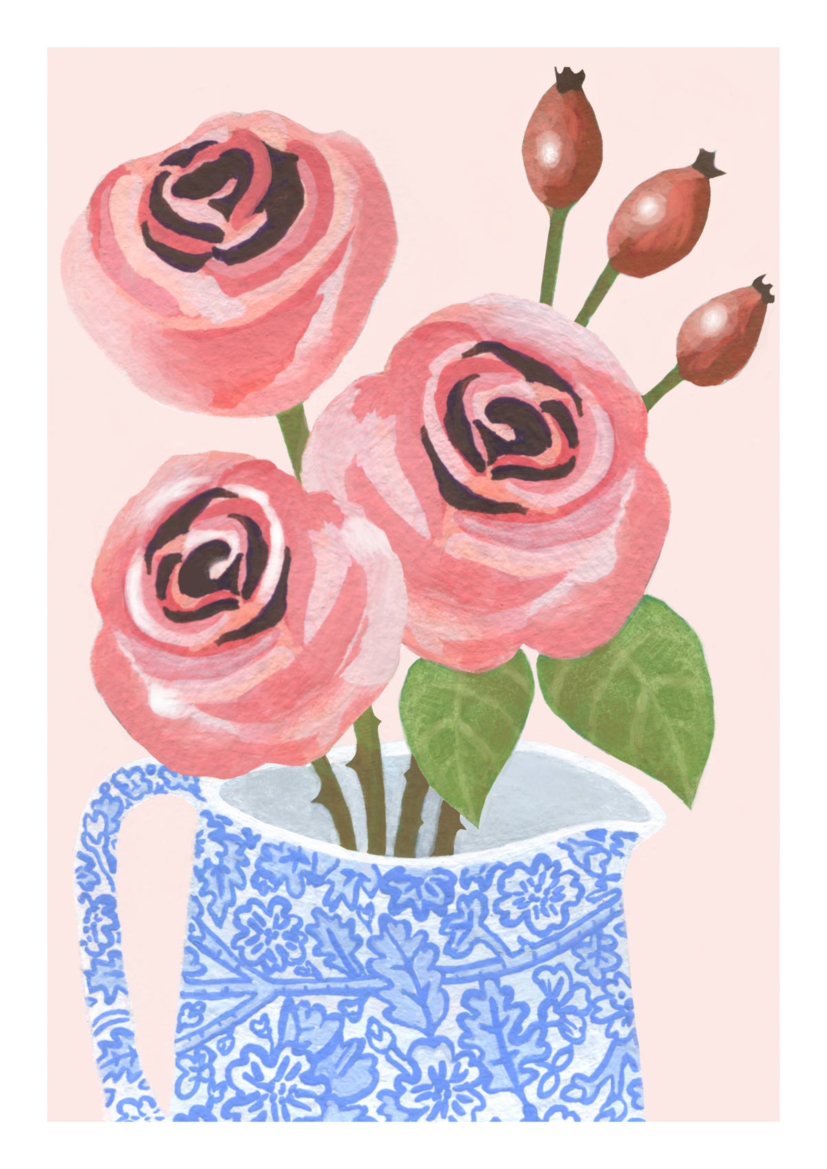 Je suis plutôt obsédé par les roses et je suis le plus heureux lorsque je m'en occupe dans le jardin. Je discute souvent avec eux tout en m'émerveillant de leur beauté. J'ai cueilli ces roses fraîches tôt un matin d'août et j'ai essayé de capturer leur élégance et leur charme dans ma peinture. La jolie cruche Burleigh s'appelle Blue Chintz, j'ai adoré recréer le petit détail de la feuille de géranium.