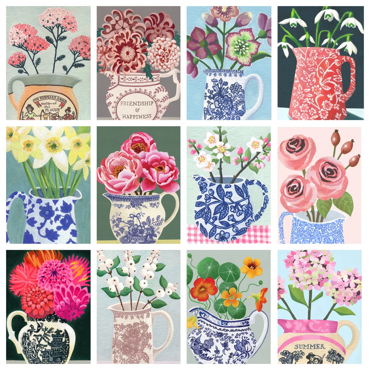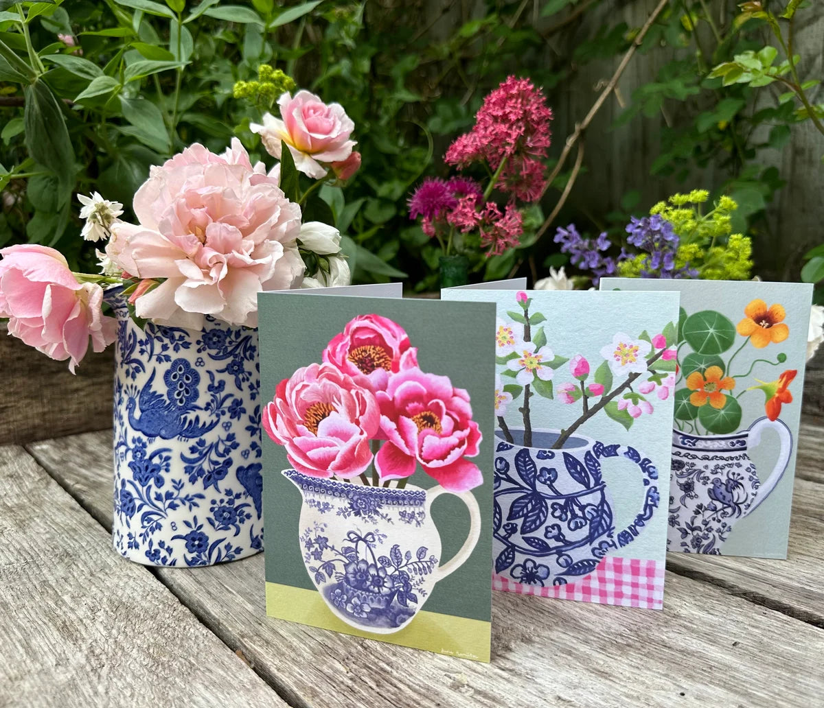 These cards combine my interpretation of classic British pottery design with seasonal flowers from my garden.